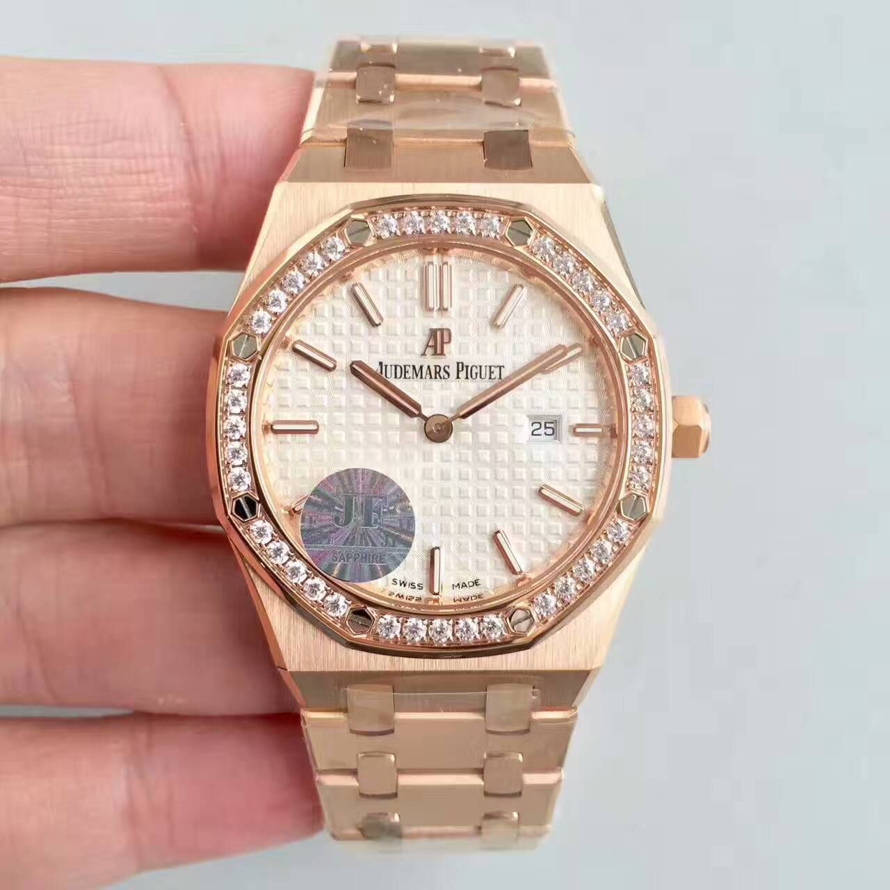 JF精品 AP爱彼67650 行业唯一买正品开模,厚度与结构和原版一样 釆用原版同类ETA石英金面机芯,ETA石英机芯是12点快跳日历。表带罗丝双边抛光和扣子唛头完全原版一致。