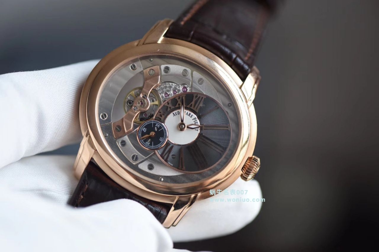 V9爱彼千禧系列15350款男装腕表,一款上手才知道靓的耐看型手表。V9不惜重金原装开模,逐个零件开模原装4101机芯,确保高度还原而且保证机芯稳定性。外层铸铜然后镀750金(镀金厚度达到5个丝),不仅接近原装的重量,而且还能持久不掉面。?和原装一样的尺寸:41毫米x47mm,厚度13毫米。表壳完全抄写原装数据,就连螺丝开孔位置和大小都一样。圈口、底盖、镜片等等零部件都时可以和原装通用的。这绝对是镂空复杂表的一个新高度,向原装致敬。 具体评测: