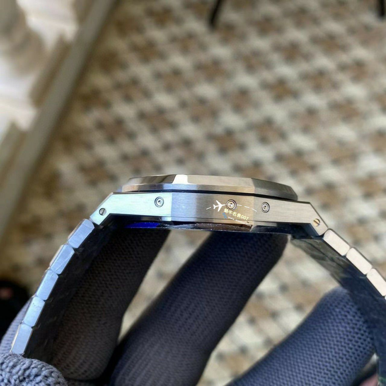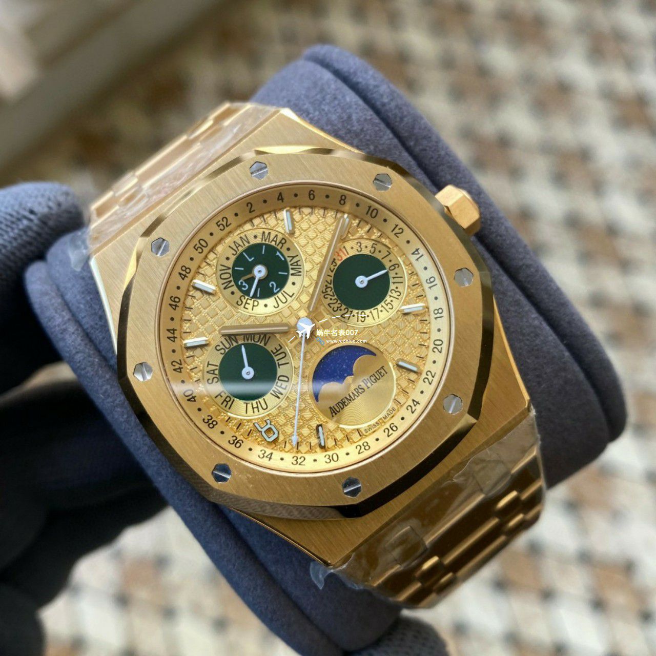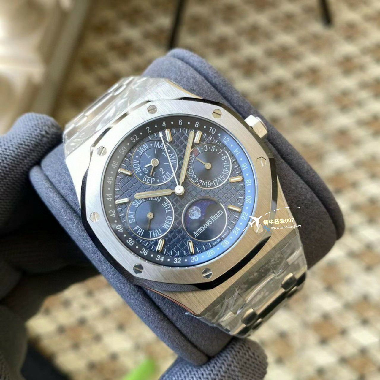 APS 26574,皇家橡树系列在“Grande Tapisserie”大格纹装饰表盘上,日期、星期、月份、月相,和四个眼睛的位置与原装同步,并以真实的月球图像显示天文精确月相,形成鲜明对比,直径41mm,一体机5134自动上链机芯,厚度10.5mm(区别市面普通版本14mm )所有功能真实可用