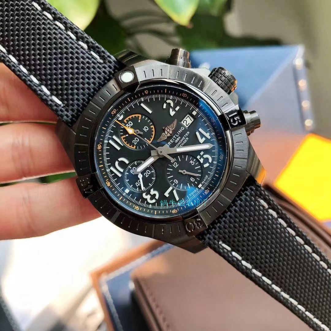 最新款官网新品,百年灵复仇者计时腕表45夜间任务版,大气奔放,坚固性和抗震性优异,将出众的精确性和强劲的设计纳入一枚轻质表壳内。作为一款真正的百年灵复仇者系列表款,它可在佩戴手套时使用,为航空探险家提供无与伦比的安全性和可靠性。复仇者计时腕表45夜间任务款采用坚固的45毫米钛金属表壳,搭载军用皮革表带,特制的阿拉伯数字时标涂覆夜光涂层,搭载原装ETA7750机芯(即官方B13机芯)弧面双面防眩目蓝宝石水晶玻璃,300m防水,官价4万+!我们的价你懂的!帮你大省一笔,配原装盒出!