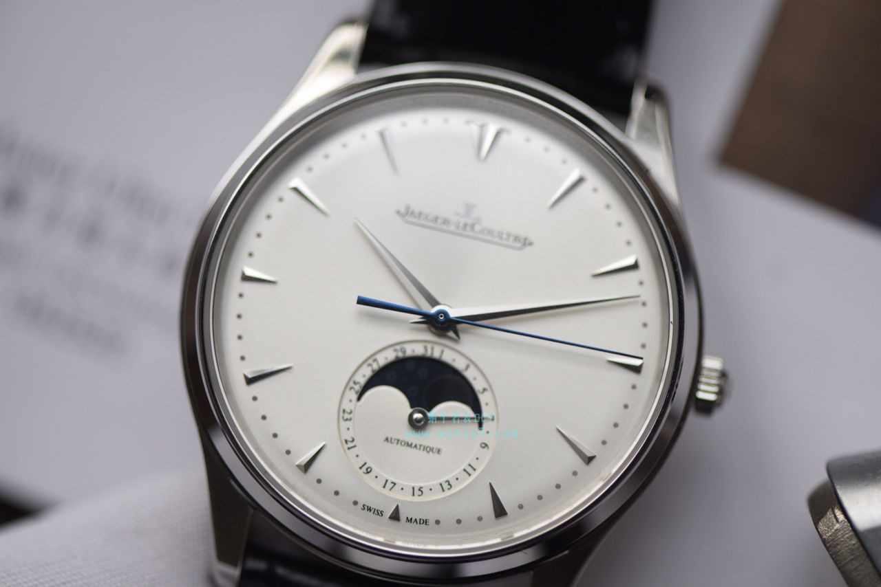 ZF新品,积家月相大师系列,表壳直径39mmX9.9mm与原装同步。六点钟的子盘拥有阳历阴历(月相)双期显示,月相一月转一圈,功能和正品一致。