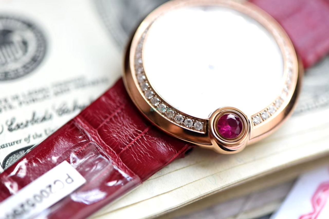 珍贵时计印刻幸福时光,闪耀红宝石装点暖意心愿,“钉”义新年好运,祈愿红运相随。开启新春红运。 鳄鱼皮 卡地亚新款白气球系列,43颗VS1.5纯天然钻石(约重0.66克拉)比起市面上的多数女表款式钻要大得多 够大才够闪 18k真金电镀 蓝宝石水晶玻璃镜面 红面鳄鱼皮表带更衬玫瑰金的光泽。比容易撞款的蓝气球耐看多了,可能这就是网红和名媛的区别。表盘尺寸30mm,表壳厚8.4mm不大不小的尺寸 卡地亚cal.157石英机芯 4点钟位置镶嵌一颗红面宝石,表带也是同面系红面鳄鱼皮 特有新年气息 与四点位宝石交相辉映,很显肤白!一级河贝母字面比起普通贝母更加闪耀 不同角度呈现不同的绮丽光彩 卡地亚腕表系列中最具中国女性特面的款式