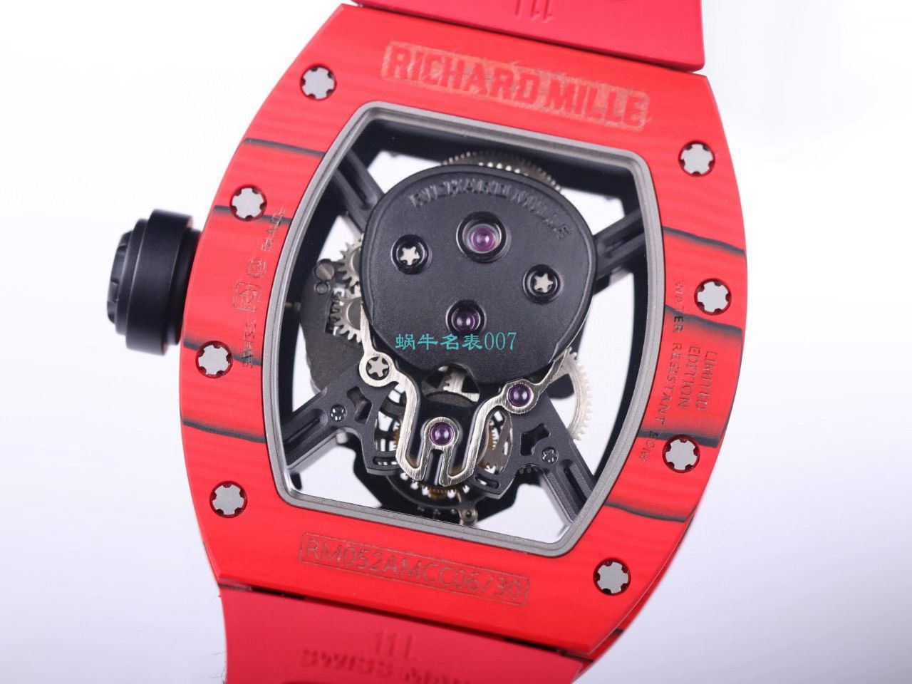 3、细节到位:表壳内罩左侧内壁和原装一样印有RM052钢印,右眼齿轮的大小和深度接近原装,额头中心宝石红润剔透,磨砂表扣、进口泰国原料橡胶表带;