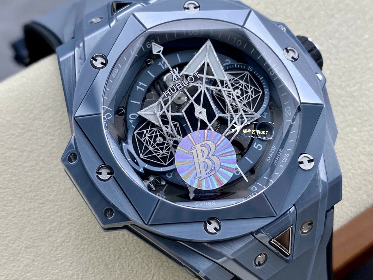 BBF极限   HUBLOT宇舶表全新 Sang Bleu II刺青二代腕表  恒宝最热门款 市面唯一标配全部钛金属,经过抛光、缎面、切片、雕刻、倒角以及刻面处理,呈现出交替叠加的六边形、菱形以及三角形,营造出和谐迷人的视觉效果  定制恒宝专属UNICO HUB 1240自动飞返计时机芯,业内唯一对版4.5字位镂空日历环与窗口,3字盘60分钟计时(注:市面7750机芯均只能计时30分钟)8字位水平离合, 9字位小秒轮。同步原装半牙型表冠刺青标志永远向上。 批边蓝宝石水晶表镜,拉砂工艺七彩纹指针质感无可挑剔   尺寸45mm 厚度16.6mm 重量153克,相似度达95%以上 全部功能完美实现  天花板级别 欢迎玩家品鉴 (BBF出品 必属精品)
